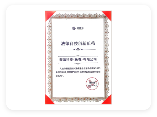 2024年4月,入选律新社《新兴法律服务业精品指南(2023中国市场)》,并荣获“2023年度法律科技创新机构”。